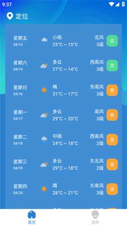 2、可以查看最新的天气预报,可以提前知道本周的天气情况,也可以提前知道空气质量。