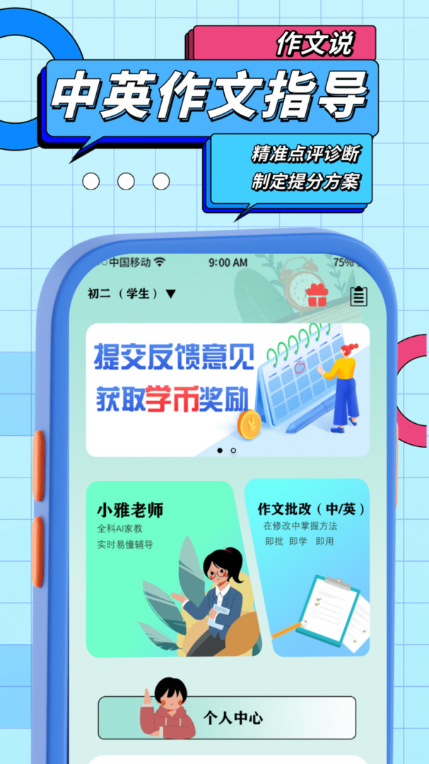作文说是一款智能作文辅导手机应用,致力于帮助用户提升写作水平,用户可以在应用中找到各种类型的范文和写作技巧,同时还提供作文素材、句型、连接词等工具,方便用户拓展写作思路,作文说还支持在线老师点评作文,为用户提供个性化的写作指导和建议。