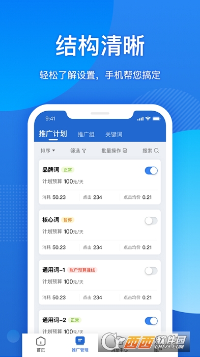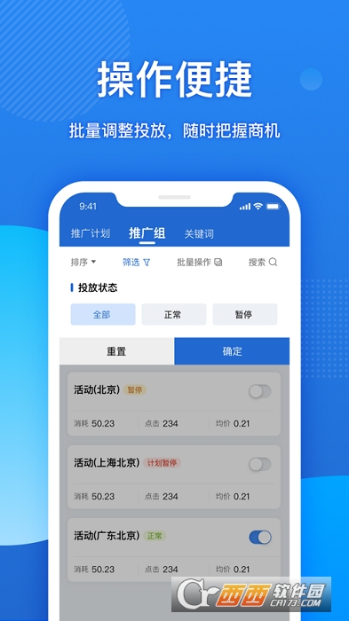 2.支持投放管理:实时查看各投放层级的物料信息,随时调整各层级投放设置,包括预算、投放地区、启用/暂停、出价等,助力把控营销推广。