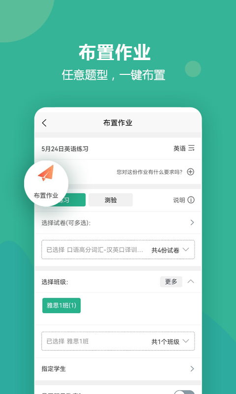1、布置作业,一键布置任意题型作业,给不同学生布置不同作业内容;