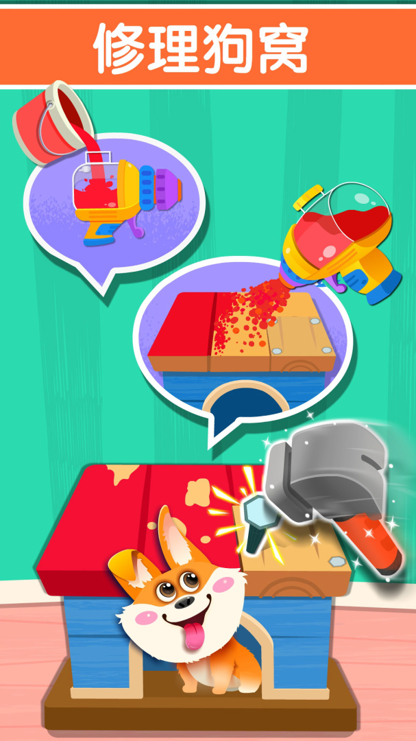 4、小狗的房子坏了,快帮他修好房顶,再刷上漂亮的油漆,小狗看见好开心;清理破掉的墙纸,挑一张粉红墙纸贴上,家里变得好温馨!(激发宝宝创造力。)