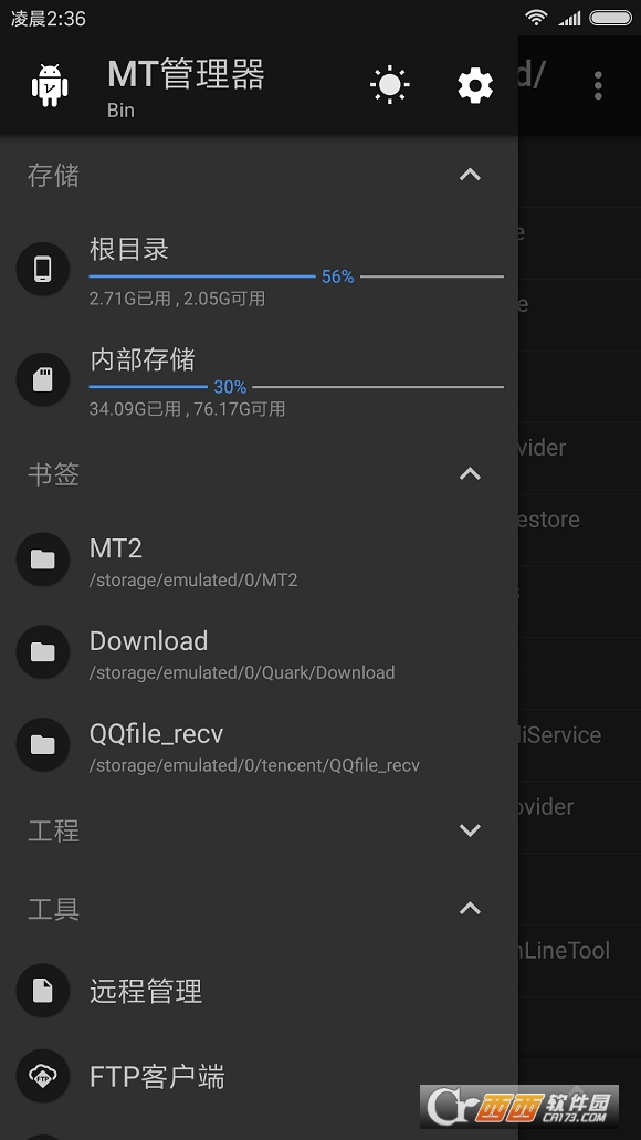 在侧拉栏中可方便地查看存储设备、FTP连接、书签、后台、工具等。