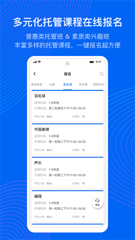 家长可以在线自由选择孩子的托管服务,包括托管时段(午托、晚托等)、选择相应的托管课程和餐食等。 轻松在线报名,在线支付。所有报名费由银保监会监管,保障家长资金安全。同时,将为每位校内托管的学生购买保险,让学生家长、学校都放心、安心