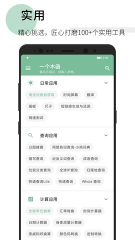 一个木函提供了与文字、图片、设备、清理、文件、计算、查询、相关的100多种工具,基本满足您在日常使用手机时的所有工具需求。