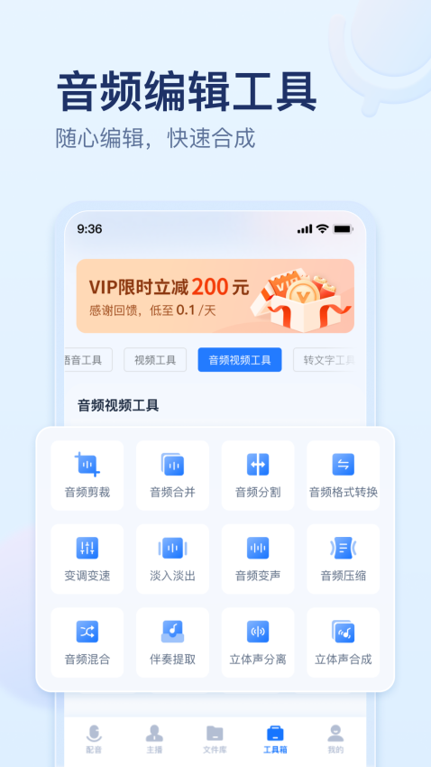 内置完整的音频编辑模块,支持音频修改、音量调节、音频裁剪、音频变声、拼接、提取和变速等操作