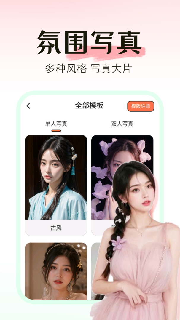 AI写真秀是一款智能人像处理手机app,每日提供各种风格的滤镜和美化功能,让用户轻松制作出高质量、惊艳的写真照片,用户可以通过app对照片进行人脸识别,然后根据个人喜好选择不同的滤镜效果,实现自定义美化,AI写真秀还具有拼图、换衣等有趣功能,帮助用户打造独特、富有创意的作品,APP支持一键分享到社交平台,让你的作品能够与朋友、粉丝进行快速分享和展示,让用户体验到快速、简单又有趣的照片编辑过程。