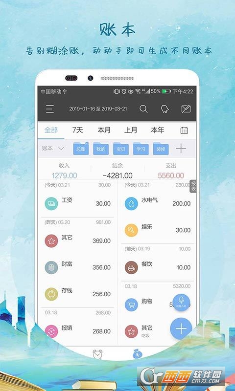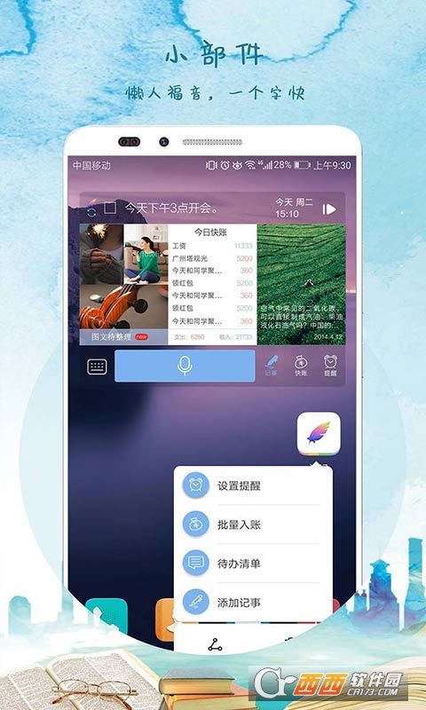 2、功能模块齐全细化,针对个人生活人性化需求。计划、快账、日记、提醒。