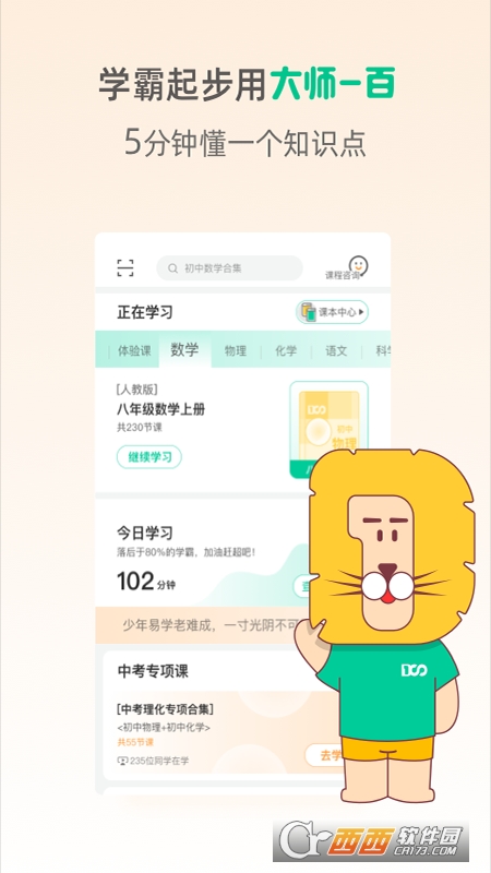 大师一百辅导是一款教育学习类型的app,用户在这款大师一百辅导app里面可以学习到很多的知识,里面,包含各种小学,初中,高中的学科,学生完全可以自定义挑选,结合校园学习课程去进行预习和复习,帮助孩子们去巩固课堂知识,功能还是比较强大的,有需要的小伙伴赶紧来下载大师一百辅导app来试试吧!