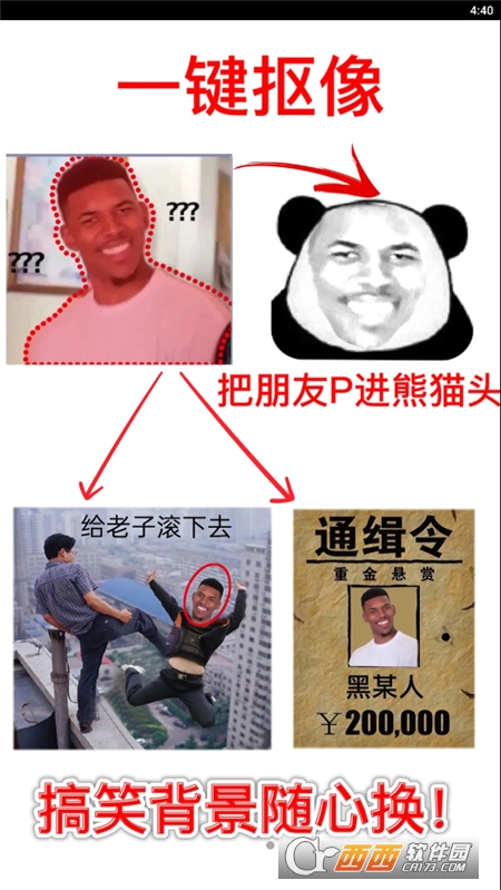 可以让您一言不合就斗图的APP。帮您制作各种有趣搞笑的表情图片,可用熊猫头、金馆长等许多流行表情进行贴图。可以抠取朋友的脸,贴到其它图片上,有趣的恶搞您的朋友。还可以手撕表情,想撕什么就撕什么,斗图无压力。