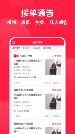 1,通告管家app利用非常完善的功能模式来进行各种接单的数据发布和综合整理,所有用户都可以更加轻松的看到各种不同的模特和艺人,洽谈合作更加简单。