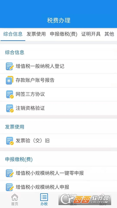 涉税费业务办理,包括税费申报、缴税缴费、发票开具、证明开具等功能;