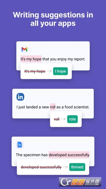 Grammarly一款能够自动帮助你检查语法是否错误的软件,对于文字的语法有着非常重要要求的人来说,这款软件对于你来说或许有着非常大帮助,但是因为只能识别英文当中的语法错误所以常用英文输入的可以尝试下载这款Grammarly!