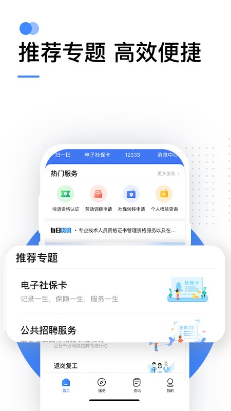 “掌上12333”分为“首页”、“服务”、“资讯”、“我的”四大服务栏目,支持电子社保卡的集成服务,主要提供养老保险待遇资格认证、全国招聘服务、社保卡服务查询、跨省异地就医费用查询等人社线上服务。