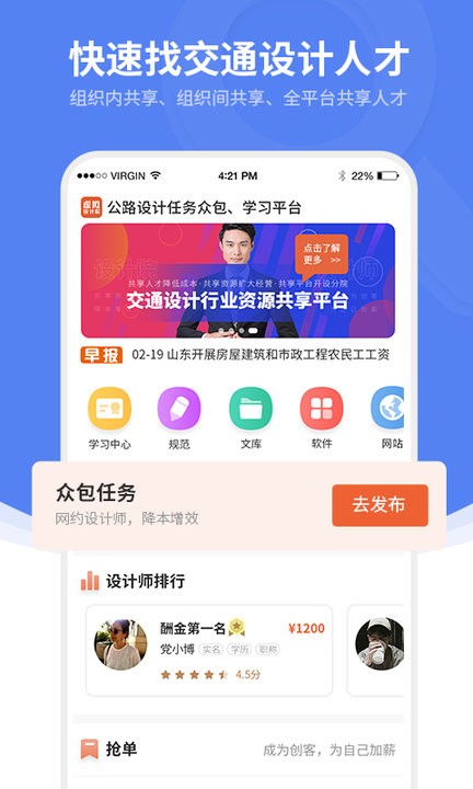 公路虚拟设计院是一款专业公路专业设计服务软件,拥有公路人公共资源库,包含了专业规范、考试资料、常用软件和常用网站内容,可以随时发布公路项目需求设计师,当然也能够帮助设计师人员抢单,拥有设计师实时排行了解,使用方法简单,接单赚钱更轻松。