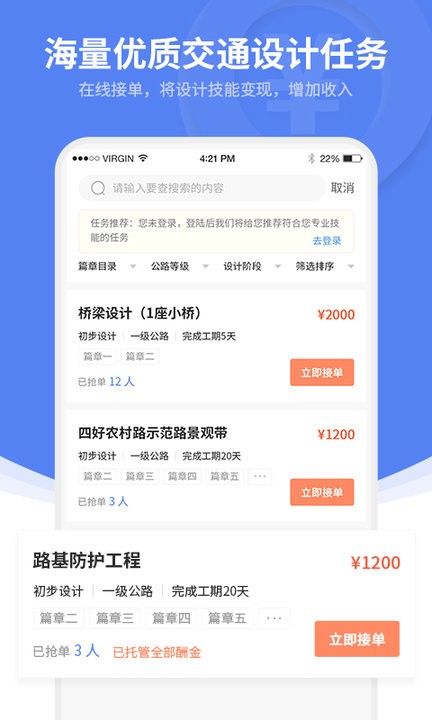 公路虚拟设计院app公路设计是专门为设计人员准备的软件,这里能发布任务、派单以及进行资金托管等,为你提供资金假话,让你可以更好的在线设计,能够更好的进行办公,公路人一定要来。