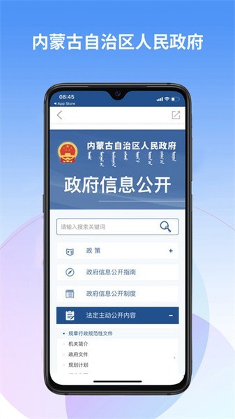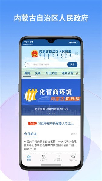 内蒙古自治区人民政府手机客户端为各位用户提供关于内蒙古地区的各类政策新闻动态,用户可以下载内蒙古自治区人民政府app了解各种方面的政策信息,还有政府权威发布的信息,也能直接关联蒙速办app办理相关的政务服务等等!