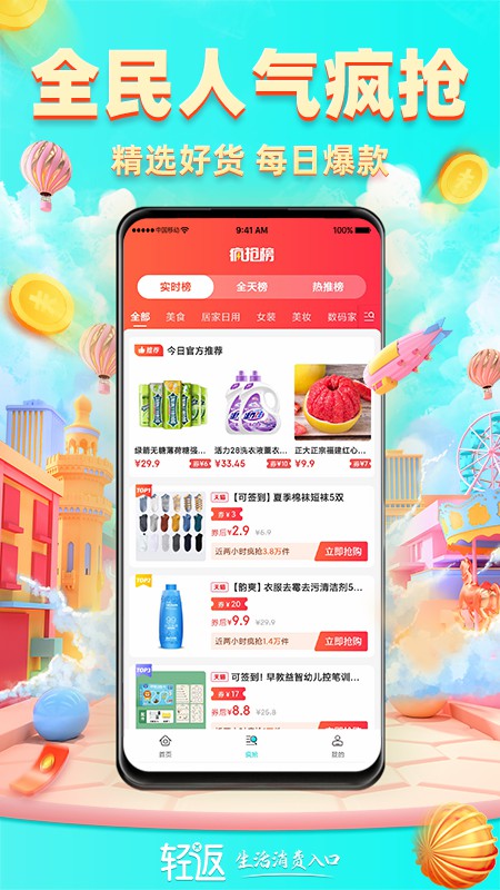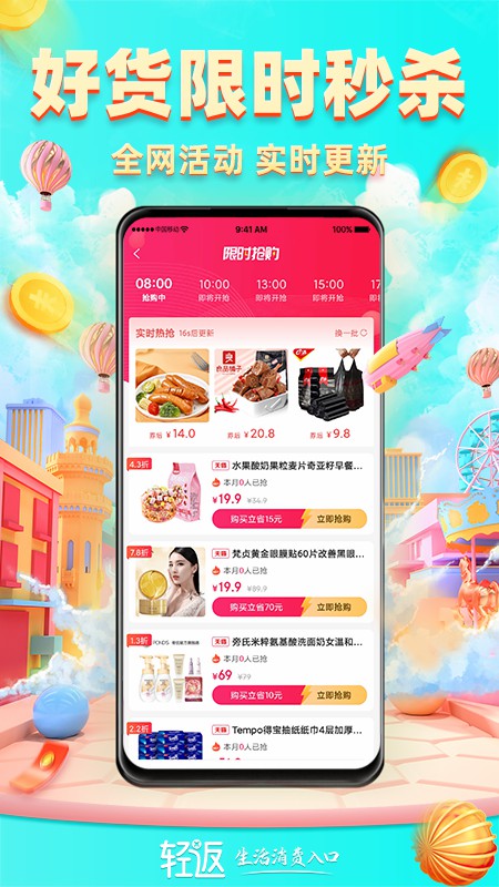 3、每天都有新品商品发布,限时好货自动推荐让你不在错过!轻返你值得拥有的购物神器!全名人气疯抢给你最优惠的购物体验!没有购物次数上的限制支持采购!将轻返分享给好友并且在他注册后你能获得无门槛的优惠券,其他的一些购物活动奖励也是非常丰富的