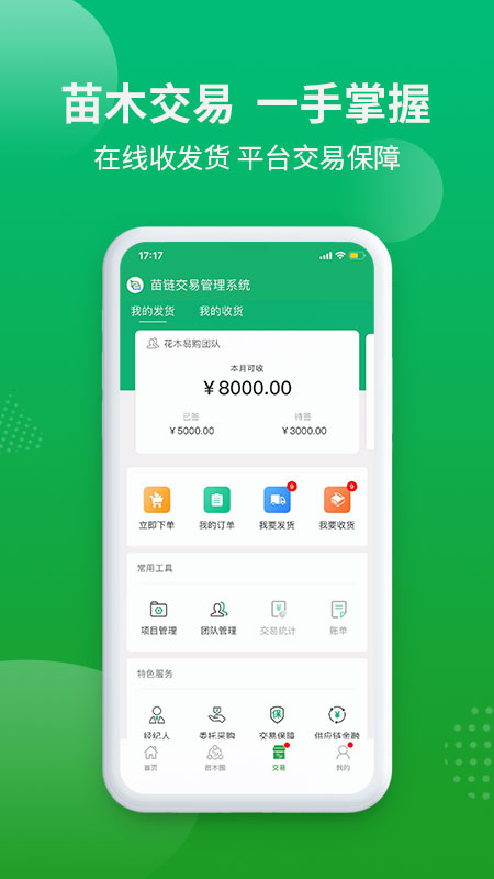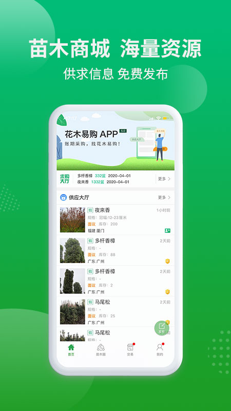 1、让广大苗农、买家、卖家等用户在线交易。支持苗木采购、资源发布、查看、订阅,经纪验苗等服务