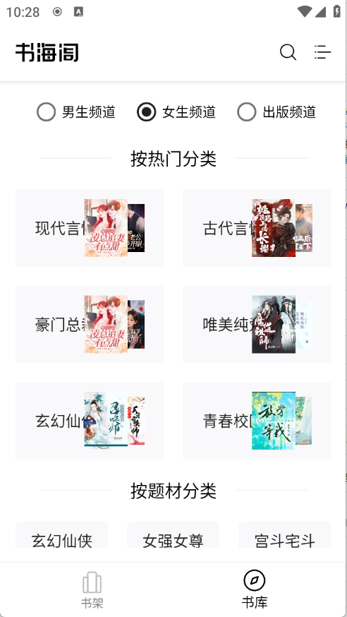 2、书库页面包含了很多的小说资源类型,言情、都市以及科幻等题材。