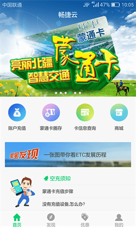畅捷云APP,为蒙通卡用户利用各类支付渠道完成资金转账后通过读写卡设备将资金自助圈存到ETC卡内提供便捷操作,使得ETC卡的充值不再局限于营业网点。