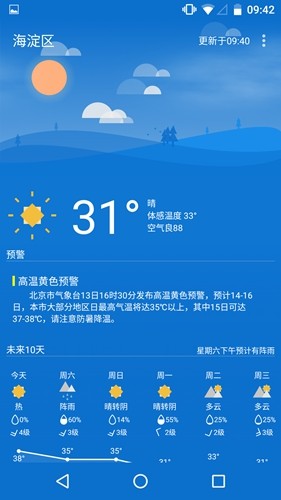 Holi天气app是一个可以让用户轻轻松松查看天气信息的专用工具,根据app用户就可以把握本地的天气转变 ,让您每日的穿衣服、交通出行都能够搞好高品质的提前准备,您的日常生活就会越来越十分的极致;app会为用户出示拟确实天气展现界面,您能够根据app的主题页面把握当日的天气情况,用户才可以应用更有意思的天气主题页面;app会立即为您消息推送相匹配的天气预警信息通告,用户就可以了解下面将要产生的暴雨、下雪、风大等天气状况,把握天气信息就会更简易;必须的用户赶紧来免费下载Holi天气安卓应用吧,之后就能把握精确的天气数据信息了!
