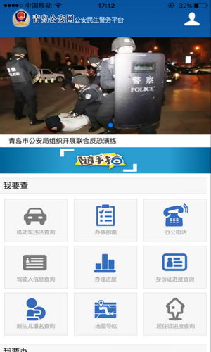 4.群众能够查看办事指南,预约.申报办理公安业务,查寻办事进度.重名.行驶证.机动车违法等讯息。