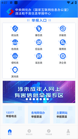 这是一款关于网络监督的平台,这里为大家提供了网络各项举报服务,让所有的公民都参与进行,如果有网络不良的内容,或者是诈骗等内容都可以在这里进行举报的。