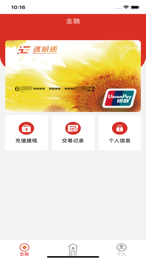 金融提供充值提现、查询交易记录、个人信息功能;