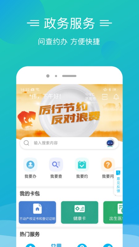 规划了“我要办”、“我要查”、“我要问”、“我要约”等板块,实现“一站式集成服务”。页面设计结合济南本地特色,使用“泉水”、“柳树”“荷花”等元素丰富页面色彩,结合“早上好”“下午好”、“晚上好”等问候语动态展示背景图,增加用户的亲情感和体验感。