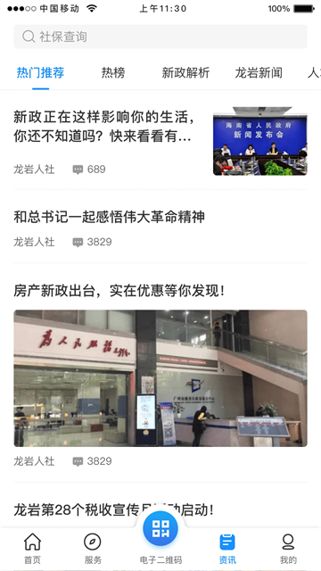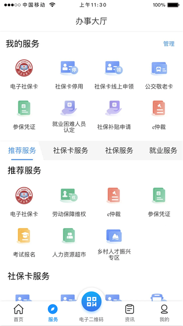 龙岩人社一卡通app下载是龙岩市人力资源和社会保障局官方倾情推出,软件拥有首页,服务,电子二维码,资讯,我的等功能服务,可以给予用户更智慧便捷社保体验。