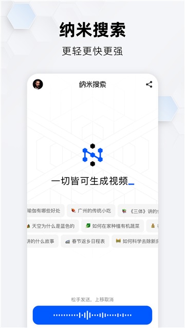 纳米搜索APP是由天津三六零快看科技有限公司所打造的一款全新AI搜索工具,相较于其他AI搜索软件,这款软件体积更小,运行更快,AI搜索功能更加强大,为大家提供了一个非常专业好用的搜索服务,使用起来十分的简单好用,有需要的小伙伴快来下载试试吧!