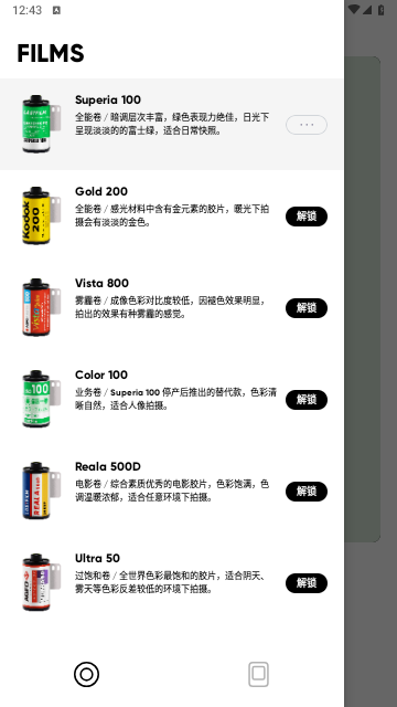 胶片选择:软件模拟了多种经典胶片的拍摄效果,如Fuji Reala 500D、Kodak Gold 00、Kodak Portra 160等,用户可以根据不同的拍摄需求选择合适的胶片。