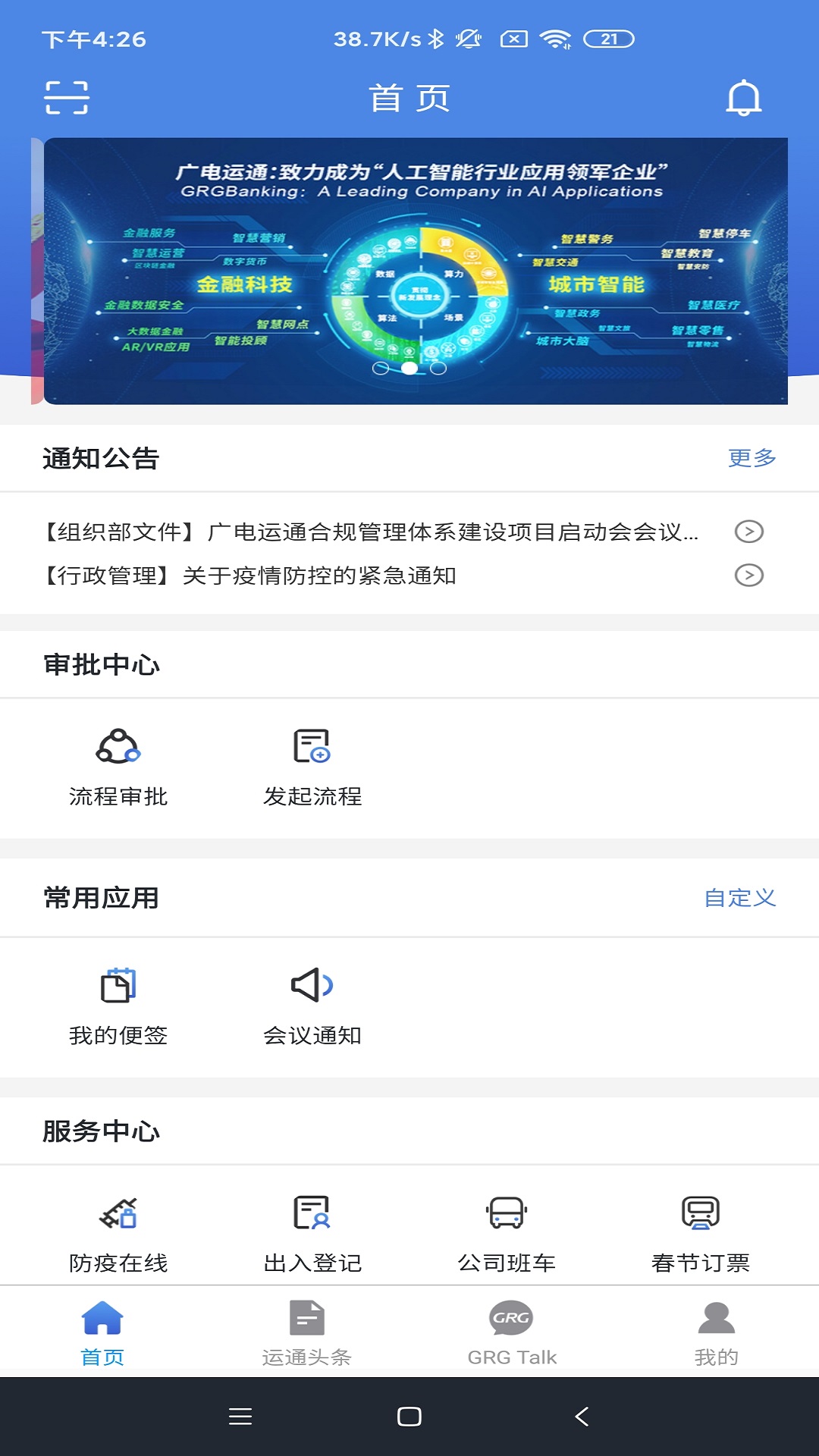 广电运通协同办公app下载安装是广电运通倾情推出的一款协同办公平台,软件拥有首页,运通头条,GRG Talk,我的等板块,包含了行政流程,业务流程,费用审批,营销审批,发起流程,流程查询,通讯等等功能,可以助力用户更智慧高效移动协同工作。