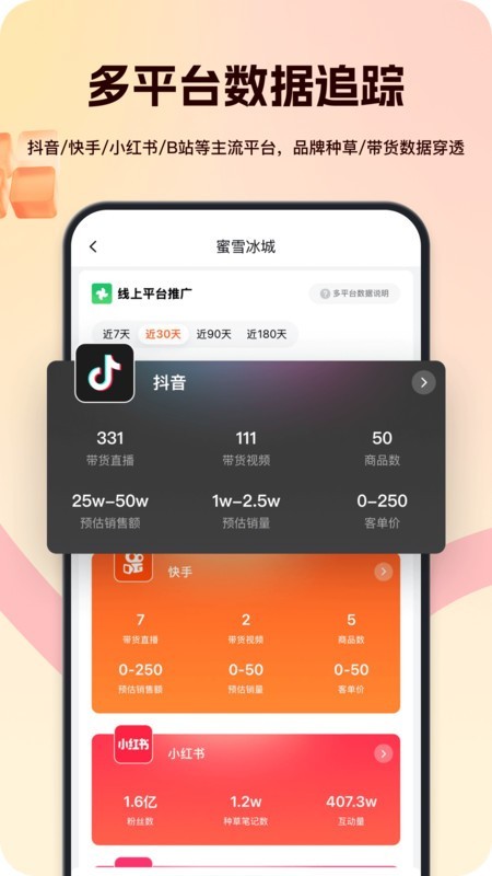 4、多平台数据追踪:抖音/快手/小红书/B站等主流平台,品牌种草/带货数据穿透