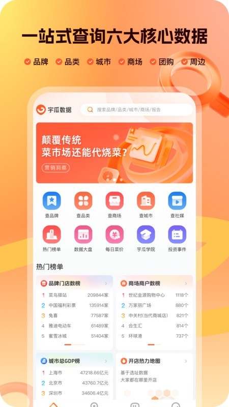 宇瓜数据app是由福州果集信息科技有限公司推出的一款线下门店经营数据分析平台,这里不止覆盖了多场景,还可以为商家经营决策作出数据支持,海量品牌库数据更加全面,欢迎前来下载!