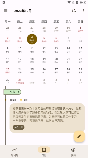 榴莲日记app是一款便捷好用的手机日记本软件,这里有提供多种实用的功能,比如你可以随时都能在线编辑日记,时刻都能记录下你的事情,不需要排版就能轻松记录,可以插入你的心情,一个心情就能胜过任何的语言,也可以在你的日记里插入多张图片,图文并茂,让你的日记更精美。