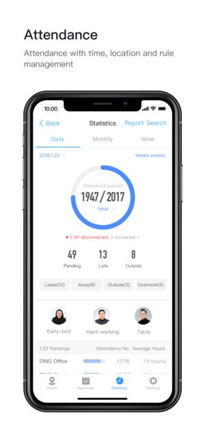在不同时间,地点和班次出勤规则的手机上打卡;所有出勤记录统一到用户跟踪和检查;离线出勤数据也可供人力资源或经理审核