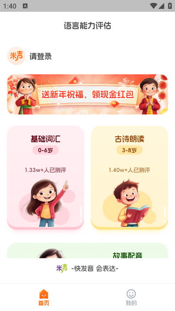 米声是一款为儿童提供语言发育服务的软件,专门针对孩子的语言能力进行测评和训练。这款应用的测评内容涵盖了从基础词汇到古诗朗读,再到故事配音等多个方面,帮助父母了解孩子在语言发展过程中的具体表现。使用起来非常方便,用户只需要选择适合孩子年龄段的内容,就能通过一系列有趣的测试来全面评估孩子的语言能力。