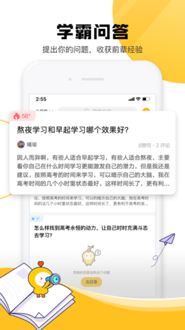 学霸问答:面向优秀的学霸,关于学习方法、考试技巧、生活习惯等等,可以直接提问哦!他们会在第一时间回复你的问题,当然优秀如你,也可以去分享自己的经验,回复其他同学的问题~