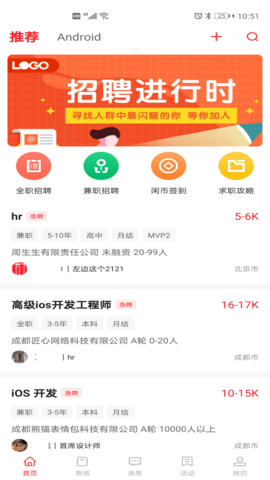 1、这里每天都有大量的工作岗位发布哦,想要找工作的亲们可以在这里了解相应的招聘信息,还可以直接和hr进行线上沟通哦。