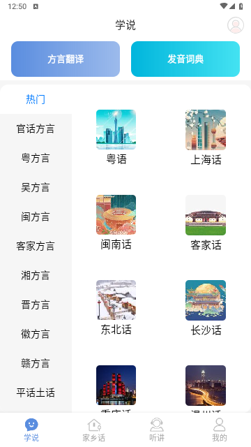 方言通是一款有丰富方言对话和方言听力的软件,对话资源。囊括了八大方言体系的主要方言对话,方言听力包含了当前热门的听力资源。是学习方言、熟悉地道方言发音的好帮手。