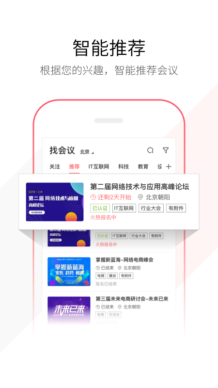 报名参会功能,搜索并查看发布的会议、活动内容,报名参与感兴趣会议、活动;
