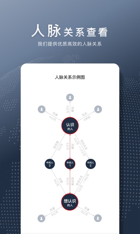 对人脉管理进行查找,可以通过人脉关系来进行匹配和查询,定位人脉和路径;