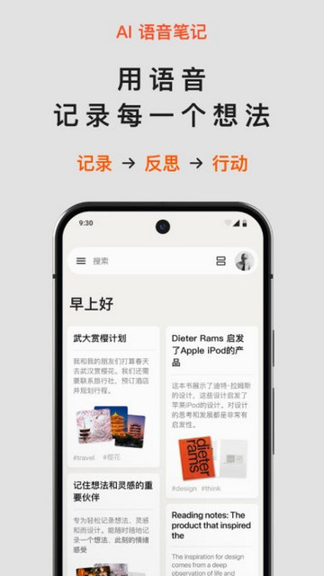 3、记录想法,用语音记录想法,AI 自动整理、格式化、添加标签和标题。支持键盘输入。