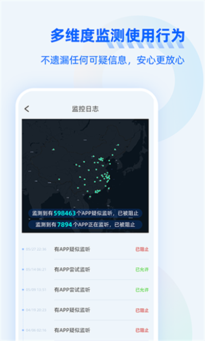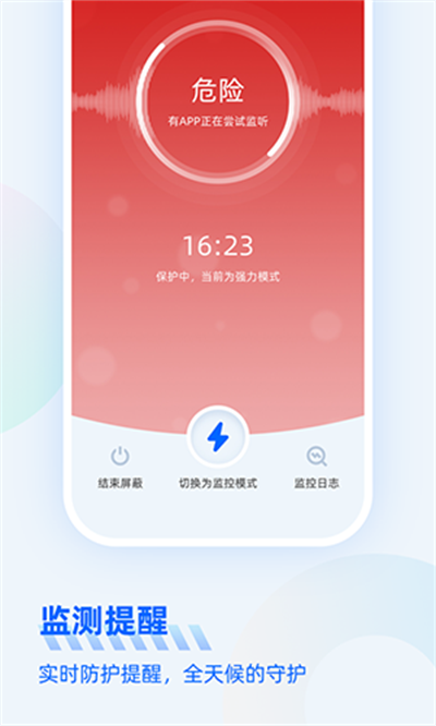 监听通话保护APP是一款非常不错的防止恶意监听软件,开启后为广大小伙伴们提供24小时守候,可以有效保障个人通话安全,一键快速拦截后台运行设备,智能化阻止,实用便捷,以及支持自定义定时,功能很齐全,可以满足所有人的需要。感兴趣的用户朋友们快来下载吧!