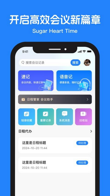 糖心时光APP是一款非常适合会议记录和日程管理的工具。它可以帮助用户高效记录会议内容,并且能够自动整理会议纪要,支持语音转换为文字,极大地提升了会议记录的效率。不管是在会议中使用速记工具,还是录制会议音频并转化为文字,糖心时光都能轻松帮你完成。此外,它的多端同步功能、智能分析和清晰展示界面,也使得团队协作和目标管理变得更加顺畅。