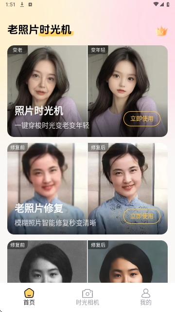 老照片时光机APP是由北京德晨网络科技有限公司所开发打造的一款免费手机相机修复使用工具,可以对老旧照片进行修复使用,上手起来非常的简单轻松可靠,操作起来非常的简单轻松,一键快速完成修复,有兴趣的话快来下载吧!