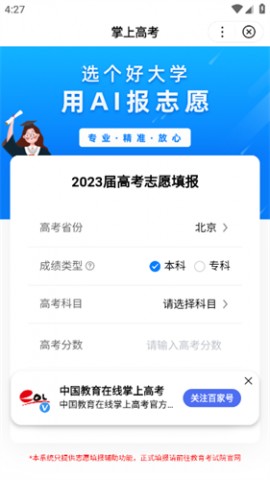 2023最新的百度高考志愿ai智能填报助手下载,为各位高考生们提供了智能分析功能,可以免费帮助大家完成志愿的填报。帮你定制化分析,选择优先意向的院校和优先意向的专业来为你提供志愿预测,帮助大家科学填报志愿。