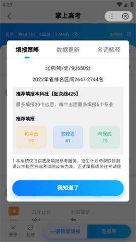 掌上高考A模拟志愿,录取概率基于学校的专业维度计算,学校录取概率为本年招生专业录取概率的最高值;采用1~3年的录取分数,结合最新年度招生计划,以及各分数段人数分布情况,通过掌上高考独家A大数据算法综合得出,通过不同录取機率分布,将志愿推荐划分为冲、稳、保、难录取,浪费分“五个维度。