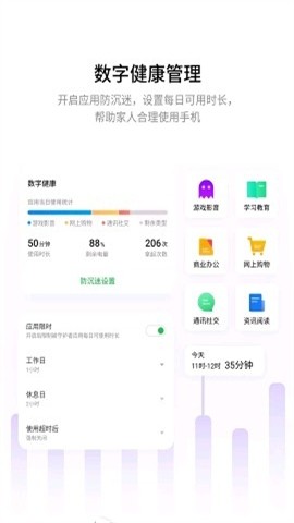 2、家庭数字健康:建立家庭守护后,守护者可查看家人手机的使用情况,为家人设置应用、应用类型的每日使用时间,帮助家人合理使用手机;
